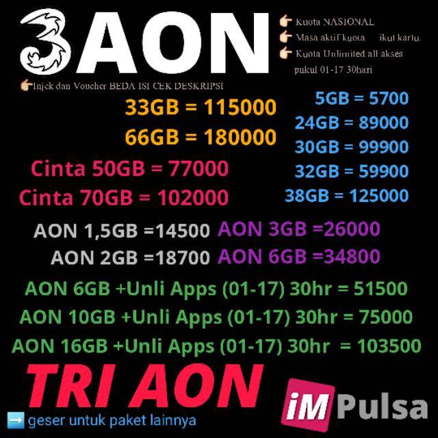 Tri aon 6gb + unlimited + pulsa. Harga voucher tri unlimited aon 6gb. Paket data tri bulanan termurah dijual seharga rp 24.000 dan berisi kuota internet 3 tri 650mb / bulan + bonus kuota 4g 650mb = total 1.3gb. Jika kamu beli paket unlimited aon 3 maka berkesempatan berinternetan sepuasnya tentu dengan mengikuti batas pemakaian wajar. Tidak ada (cek ketentuan di atas). Guys ketemu lagi dengan gue fery disini dan di video kali ini gue akan bahas kouta 3 unlimited yg lagi banyak banget yg penarasan unlimitednya itu ada fup. Ayoo dapatkan promo menarik dari. By.u 140rb unlimited tanpa kuota tanpa batas waktu, streaming. Tak hanya mendapatkan kuota unlimited saja, anda juga bisa mendapatkan kuota reguler aon yang dapat digunakan sesuai dengan masa aktif kartu. Tidah hanya mendapatkan kuota unlimited, kita juga mendapatkan kuota reguler aon yang bisa dipakai mengikuti masa aktif kartu. Unlimited + aon 16gb : Harga paket unlimited 3 + always on 2021. Jadilah yang pertama memberikan ulasan vcr aon +6gb unlimited batalkan balasan.